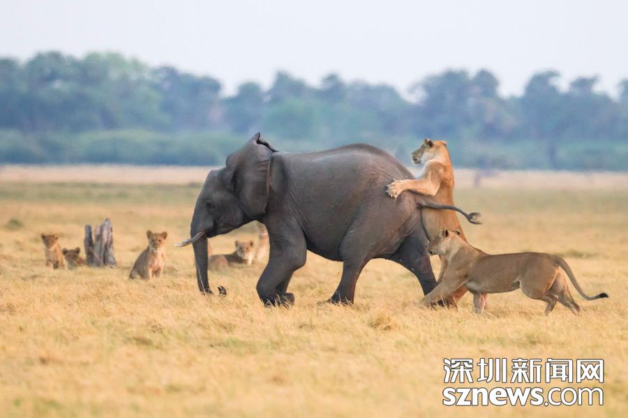 英國(guó)攝影師詹姆斯(James Gifford)在博茨瓦納喬貝國(guó)家公園拍到一群獅子獵食大象的精彩畫(huà)面。在詹姆斯的鏡頭下,一頭母獅跳到了一頭小象的背上想要將其拿下,但僅憑一己之力又不能做到。但當(dāng)母獅的后援抵達(dá)時(shí),象群也趕到了現(xiàn)場(chǎng)。最終,小象回到了象群中獲得庇護(hù),而獅群也不得不悻悻離去。