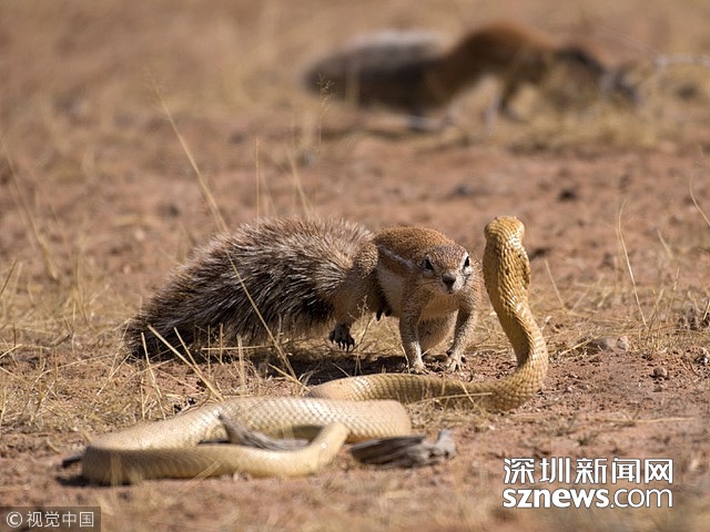 當(dāng)?shù)貢r間2016年10月25日,南非博茨瓦納的卡格拉格帝越界公園, 眼鏡蛇和地松鼠之間發(fā)生激烈打斗,但都沒有受傷。野生動物攝影師Hannes Rossouw拍攝了這一過程。