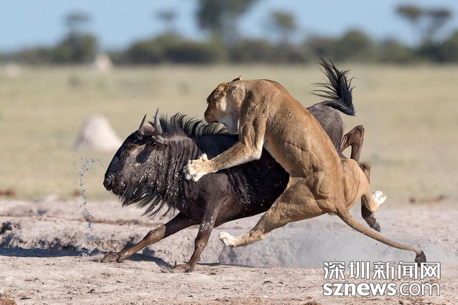 英國攝影師蘇-莫里斯(Sue Morri)在博茨瓦納Nxai Pan國家公園游玩,目睹了一場兇惡母獅獵食角馬的畫面。母獅甚至攀到了角馬背上,想要牢牢遏制住到手的“美餐”。強壯的角馬努力地與母獅抗爭,竭力想要保住自己的性命,但最終還是不敵母獅被拿下,最后成了母獅孩子們的盤中餐。