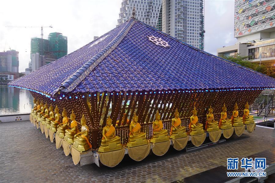 這是斯里蘭卡科倫坡的水中廟(5月27日攝)。 在科倫坡貝拉湖上有一座木造樓閣——水中廟。木造建筑上面覆蓋著藍(lán)瓦,外圍環(huán)繞著線條優(yōu)美的佛像。樓閣外高臺(tái)上供奉的佛像,與不遠(yuǎn)處的高層建筑相互映照。祥和寧?kù)o的水中廟已成為人們修心、祈福的重要場(chǎng)所。 新華社記者唐璐攝