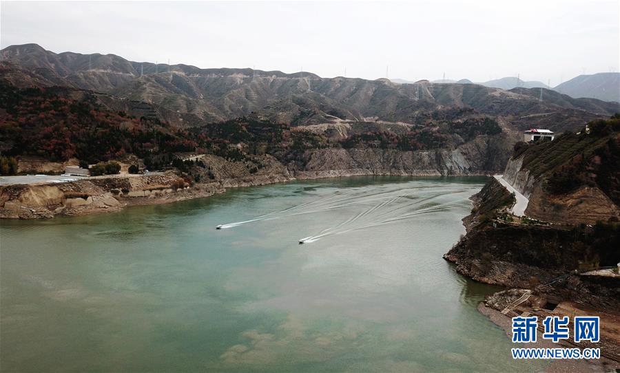 10月24日,兩艘快艇從劉家峽水庫(kù)庫(kù)區(qū)駛過(無人機(jī)拍攝)。 新華社記者 陳斌 攝