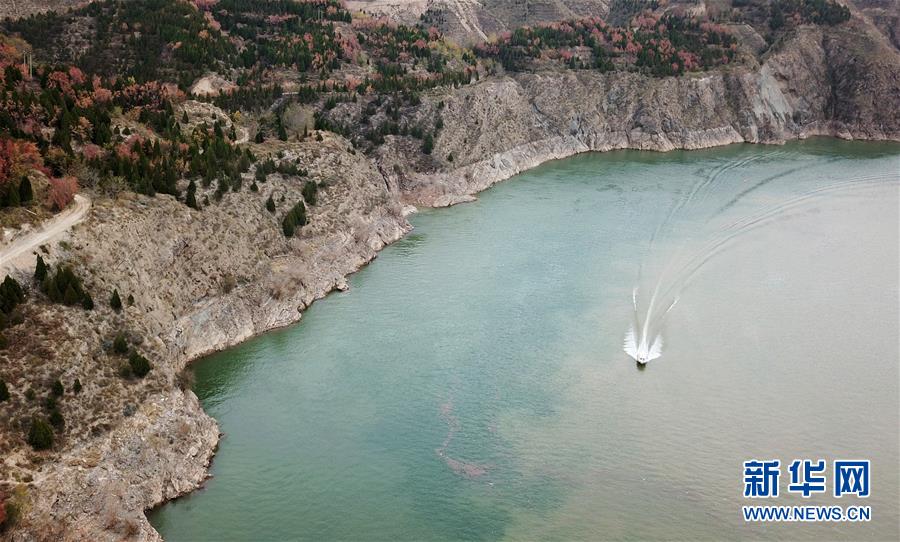 10月24日,一艘快艇從劉家峽水庫(kù)庫(kù)區(qū)駛過(無人機(jī)拍攝)。 新華社記者 陳斌 攝