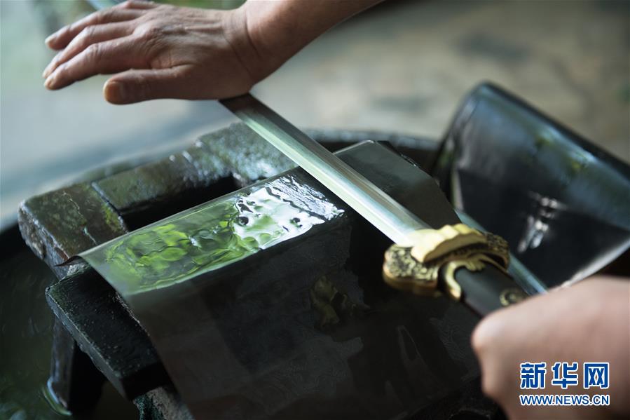 5月21日,鄭國榮在“古越劍鋪”打井水準備為寶劍淬火。他說淬火用的水很重要,正是看中了這口井他才把工作室設(shè)在這里。 新華社記者 翁忻旸 攝