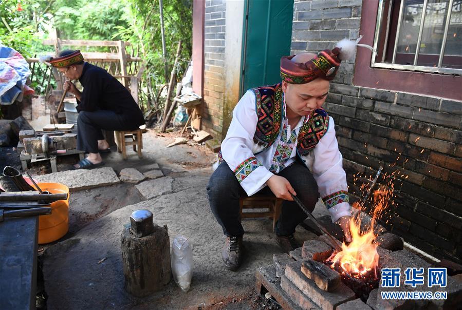 5月29日,在廣西融水苗族自治縣融水鎮(zhèn),銀匠陳四先鼓風吹旺炭火準備打造銀飾。
