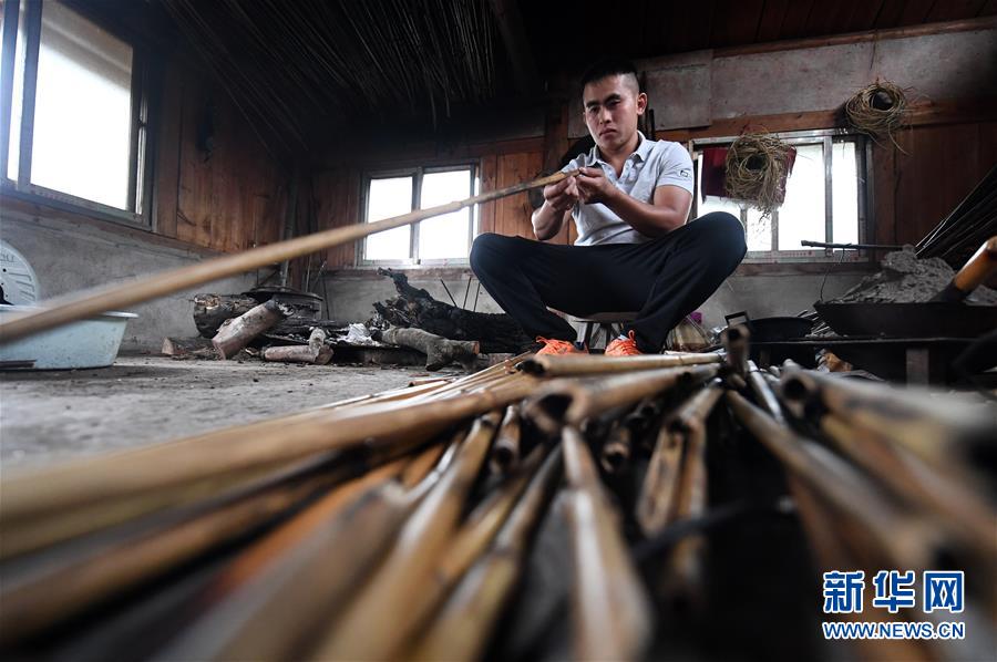 5月30日,在融水苗族自治縣安太鄉(xiāng)小桑村青山屯,杜信文在挑選熏干的竹子準備做蘆笙。