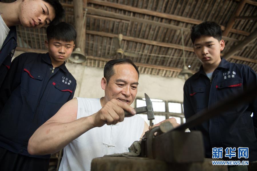 5月21日,鄭國榮在“古越劍鋪”向徒弟們傳授寶劍淬火技藝。 新華社記者 翁忻旸 攝