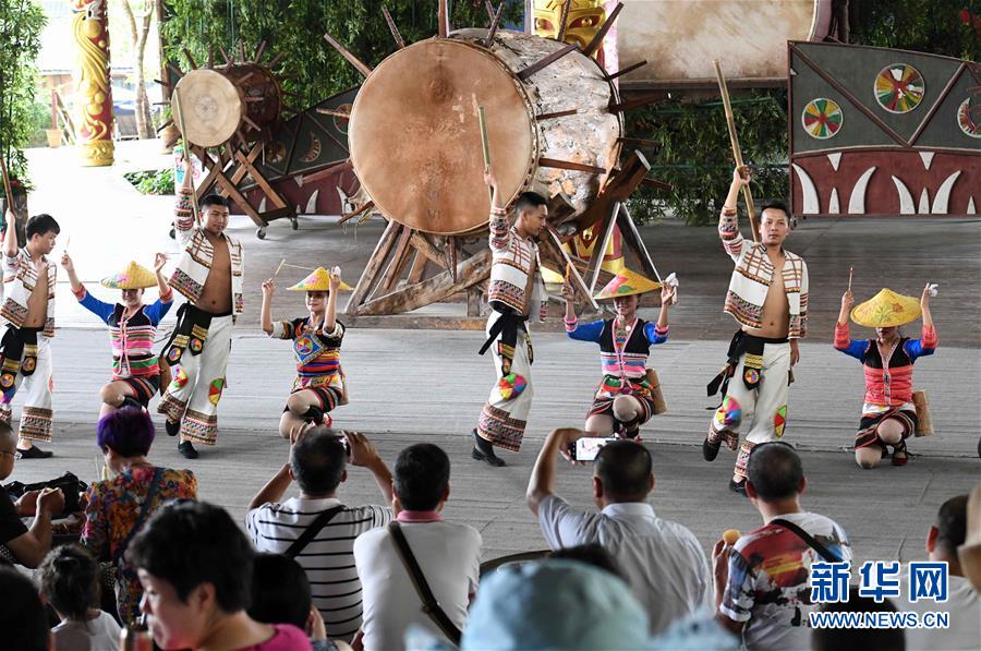 基諾族演員在表演大鼓舞(6月1日攝)。 在云南省西雙版納傣族自治州景洪市基諾山基諾族鄉(xiāng)的基諾族村寨,每天的基諾大鼓舞表演吸引了眾多游客前來觀賞體驗(yàn),帶動(dòng)了基諾族群眾就業(yè)和增收。基諾族大鼓舞蘊(yùn)涵豐富的歷史文化內(nèi)涵,已被列入國家級(jí)非物質(zhì)文化遺產(chǎn)保護(hù)名錄。 新華社記者 楊宗友 攝