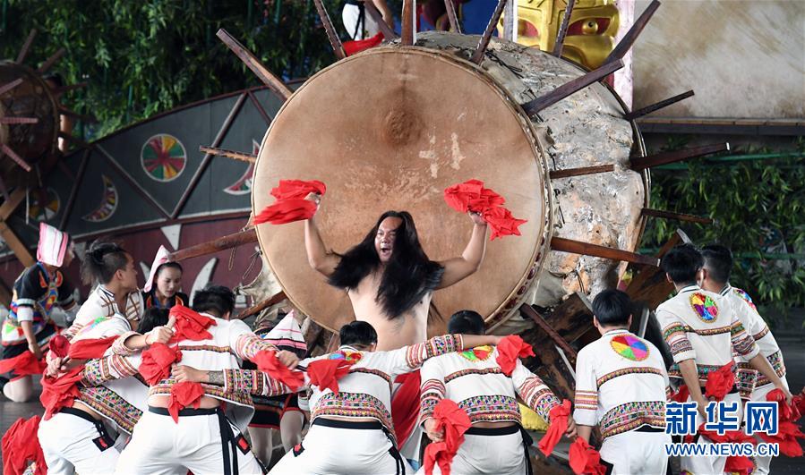 基諾族演員在表演大鼓舞(6月1日攝)。 在云南省西雙版納傣族自治州景洪市基諾山基諾族鄉(xiāng)的基諾族村寨,每天的基諾大鼓舞表演吸引了眾多游客前來觀賞體驗(yàn),帶動(dòng)了基諾族群眾就業(yè)和增收?;Z族大鼓舞蘊(yùn)涵豐富的歷史文化內(nèi)涵,已被列入國家級(jí)非物質(zhì)文化遺產(chǎn)保護(hù)名錄。 新華社記者 楊宗友 攝