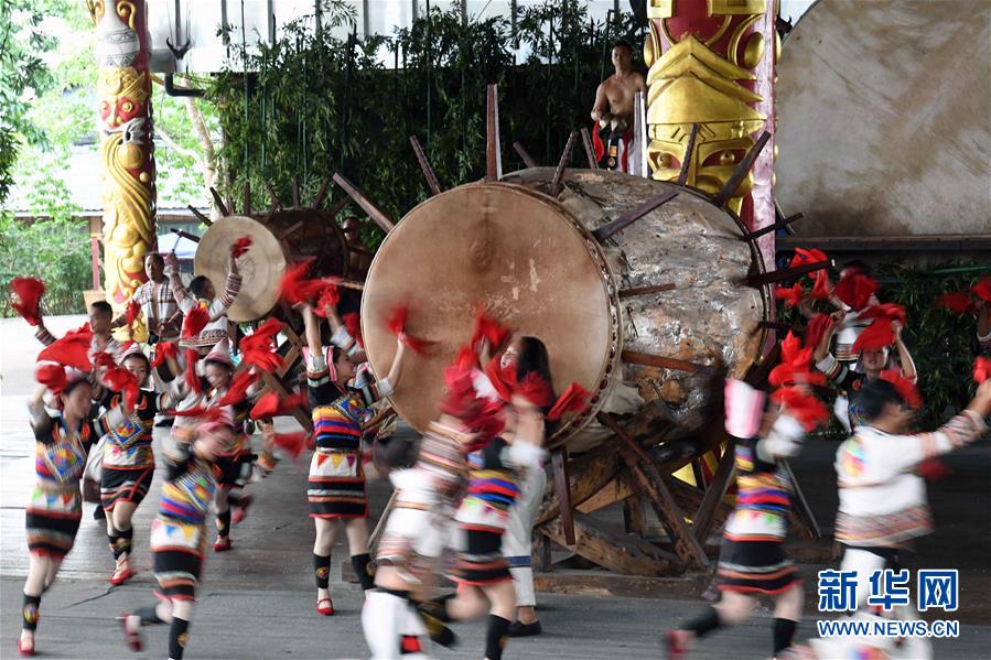 基諾族演員在表演大鼓舞(6月1日攝)。 在云南省西雙版納傣族自治州景洪市基諾山基諾族鄉(xiāng)的基諾族村寨,每天的基諾大鼓舞表演吸引了眾多游客前來觀賞體驗,帶動了基諾族群眾就業(yè)和增收?;Z族大鼓舞蘊涵豐富的歷史文化內(nèi)涵,已被列入國家級非物質(zhì)文化遺產(chǎn)保護名錄。 新華社記者 楊宗友 攝