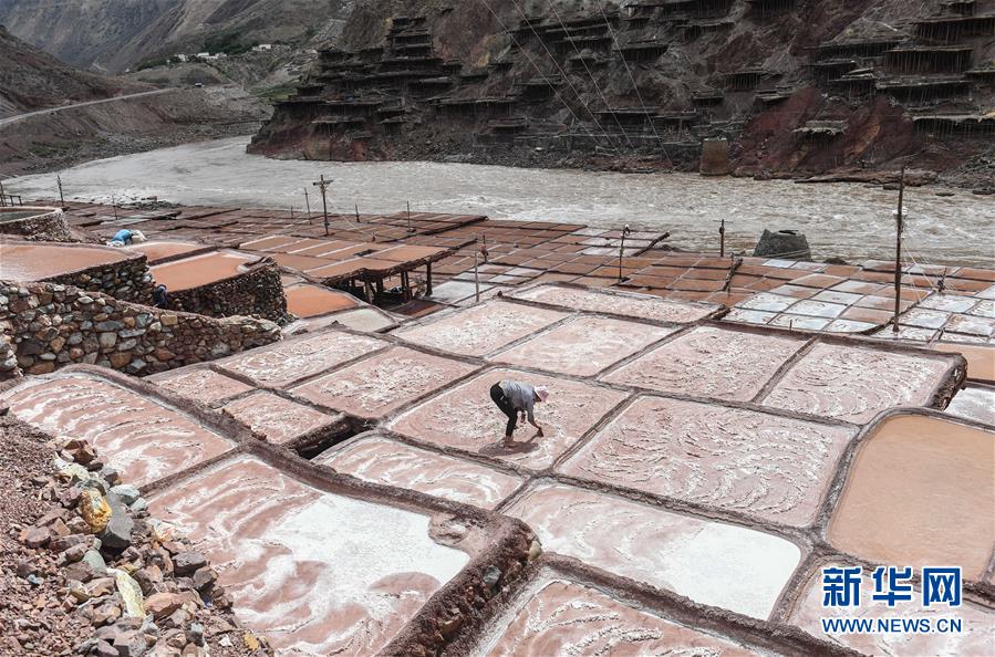 西藏芒康縣納西民族鄉(xiāng)加達村村民在鹽田曬鹽(6月4日攝)。新華社記者晉美多吉攝