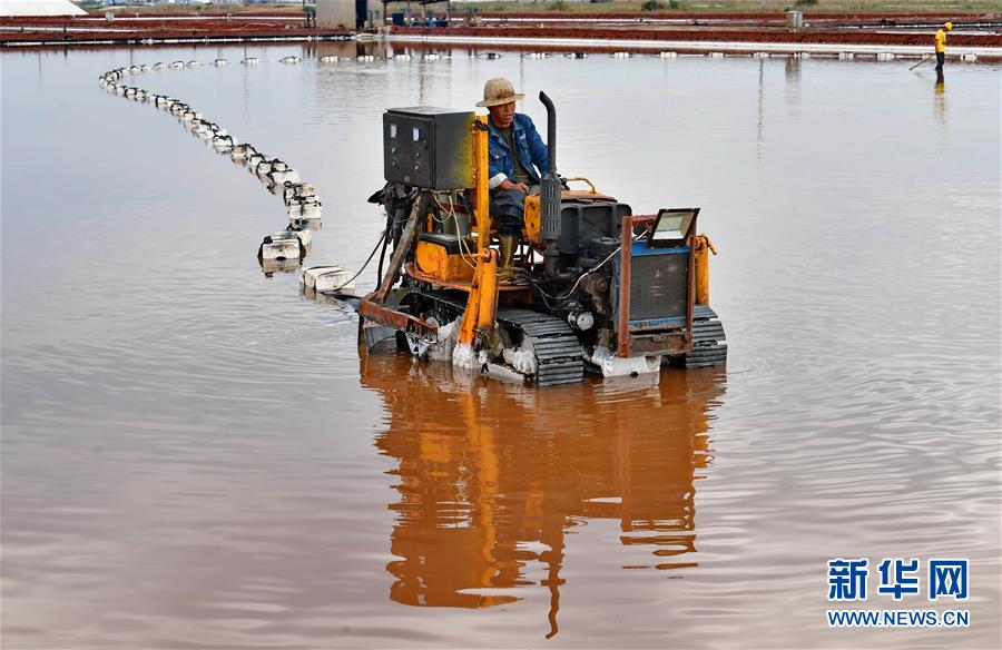 7月2日,唐山海港經(jīng)濟開發(fā)區(qū)大清河鹽場的工人在操作機械設(shè)備收獲春鹽。新華社記者 楊世堯 攝