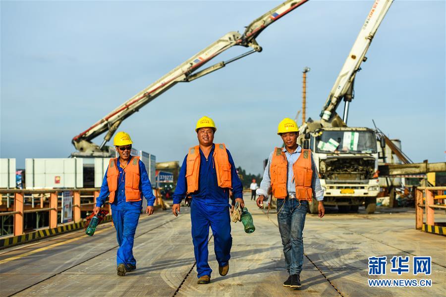 中鐵大橋局施工人員行走在湛江調(diào)順跨海大橋臨時鋼棧橋上(7月6日攝)。 新華社記者 劉大偉 攝