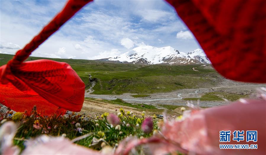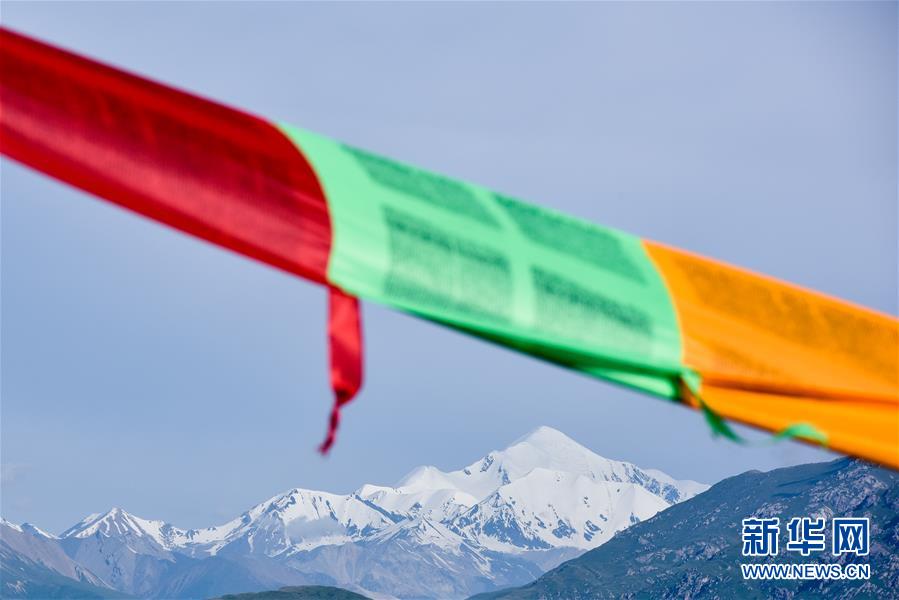 7月10日,阿尼瑪卿雪山山下掛著經(jīng)幡。  新華社記者 張宏祥 攝