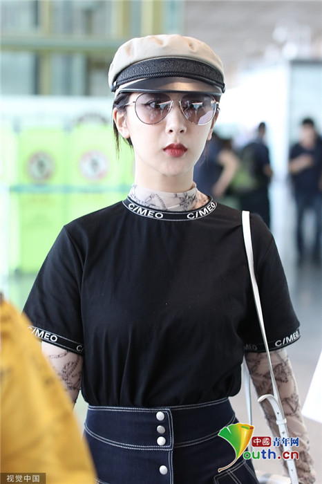 2019年7月25日,北京,楊紫現(xiàn)身機(jī)場。她穿黑色短T配牛仔裙變時髦女郎,戴報(bào)童帽架墨鏡”港風(fēng)女sir“即視感,人氣爆棚。