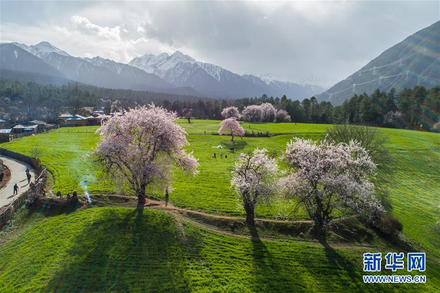 西藏林芝波密縣境內(nèi)桃花盛開(kāi)的田園風(fēng)光(4月5日無(wú)人機(jī)拍攝)。