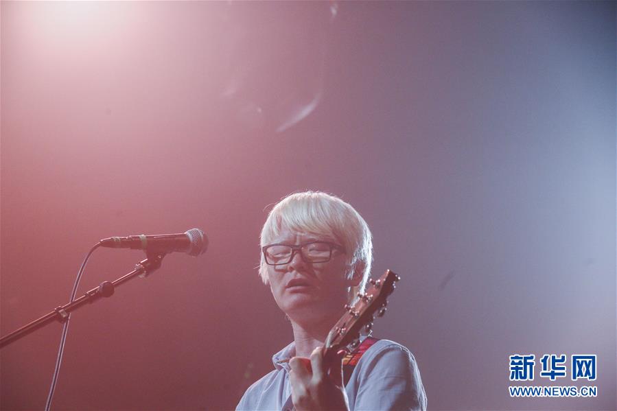 8月14日,8772樂隊(duì)發(fā)起人、隊(duì)長(zhǎng)王奕鷗在演唱會(huì)上表演。新華社記者張玉薇攝