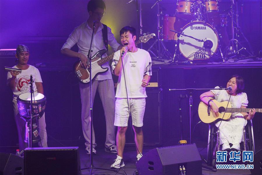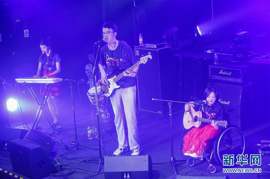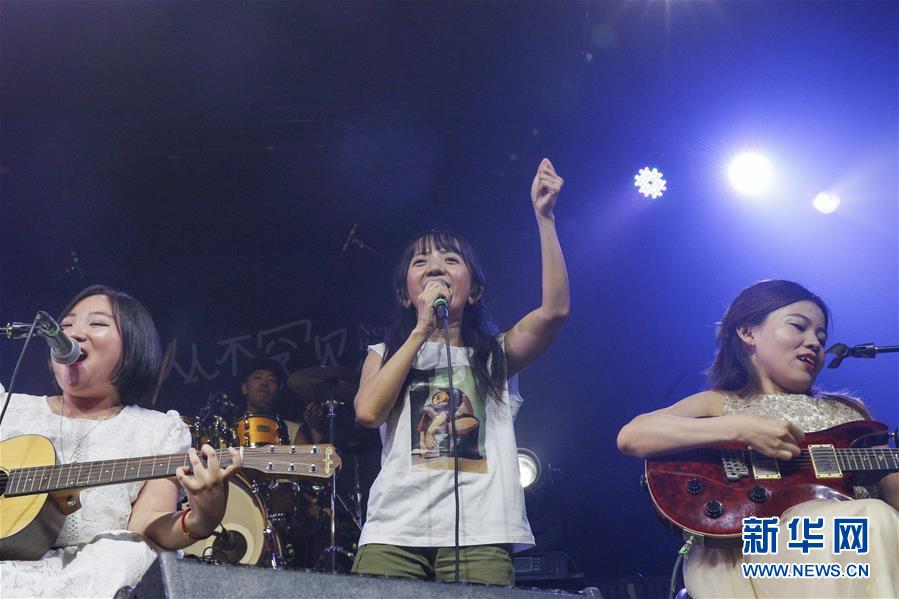 8月14日,8772樂隊(duì)發(fā)起人、隊(duì)長(zhǎng)王奕鷗(中)和樂隊(duì)成員崔瑩(左)、程利婷在演唱會(huì)上表演。新華社記者張玉薇攝