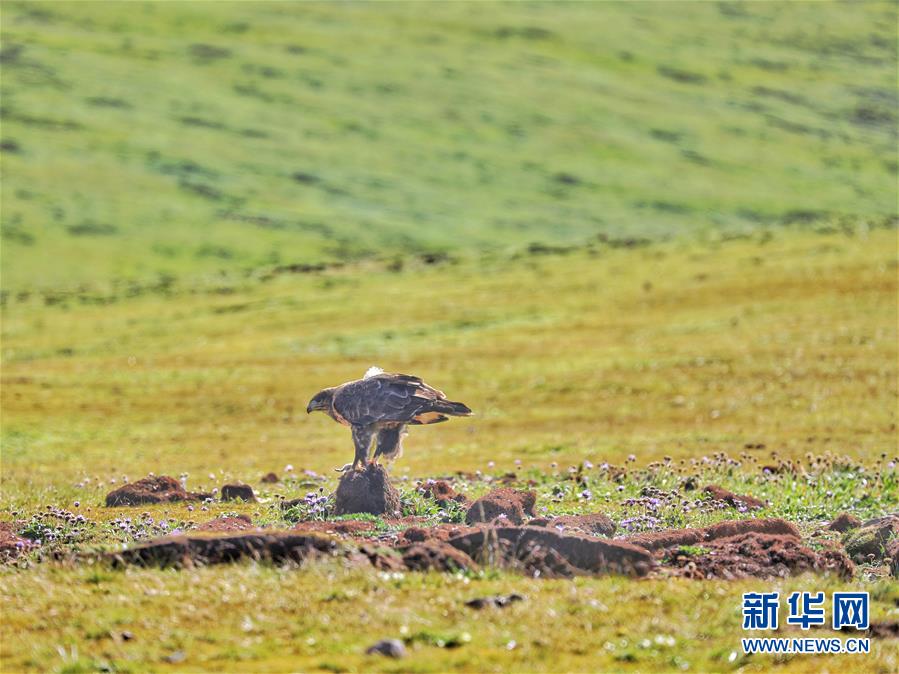 一只大鵟準(zhǔn)備享用捕獲的獵物(8月14日攝)。 8月12日至14日,來(lái)自全國(guó)各地的31名自然愛(ài)好者聚集在海拔4200米的青海省玉樹(shù)藏族自治州稱(chēng)多縣嘉塘草原,參加“2019嘉塘自然觀察節(jié)”。自然愛(ài)好者用獨(dú)特視角記錄珍稀野生動(dòng)植物,觀察三江源生態(tài)。 新華社記者 張大川 攝