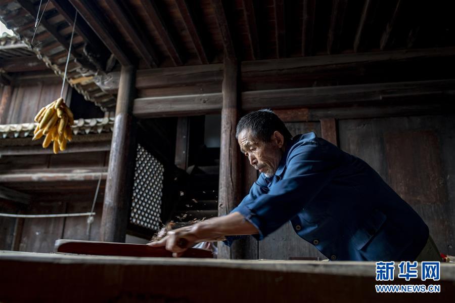 73歲的石屏縣異龍鎮(zhèn)符家營村村民楊國保在家中制作村里修整老屋所需的木梁(8月8日攝)。新華社記者 江文耀 攝