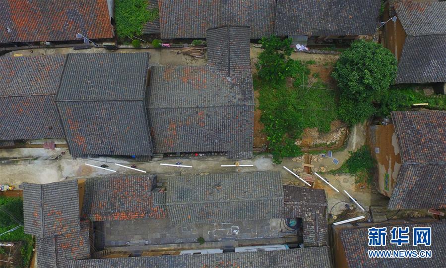 龍革雄和村民一起搬運(yùn)雨污分流工程水管(2017年8月18日無(wú)人機(jī)拍攝)。新華社記者 黃孝邦 攝