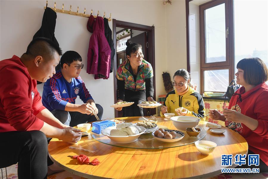 在舒蘭市二合屯,吳慶榮(右三)在自家的農家樂內為游客上菜(1月26日攝)。新華社記者許暢攝