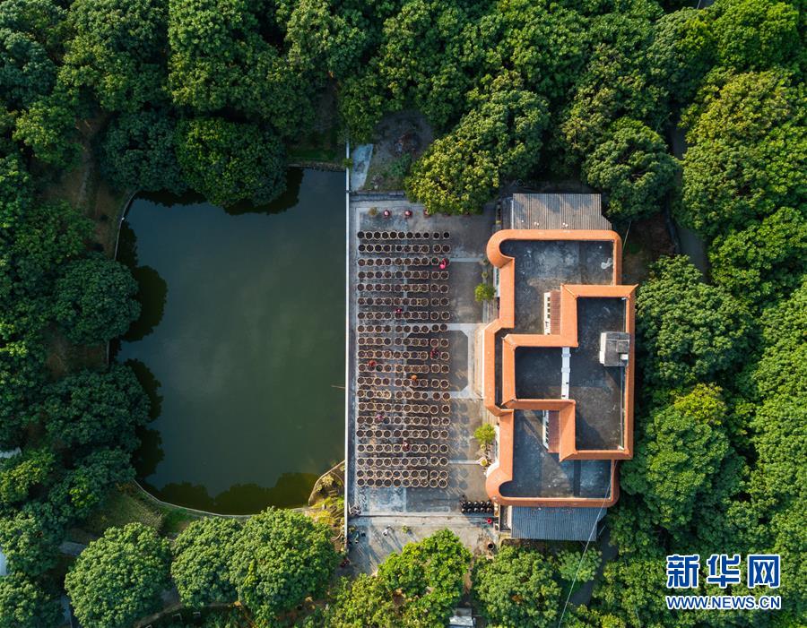 在福建省永春縣岵山鎮(zhèn)茂霞村熟地文創(chuàng)園,村民在晾曬用當地傳統(tǒng)手藝制作的藥材——熟地(1月28日無人機拍攝)。 新華社記者 宋為偉 攝