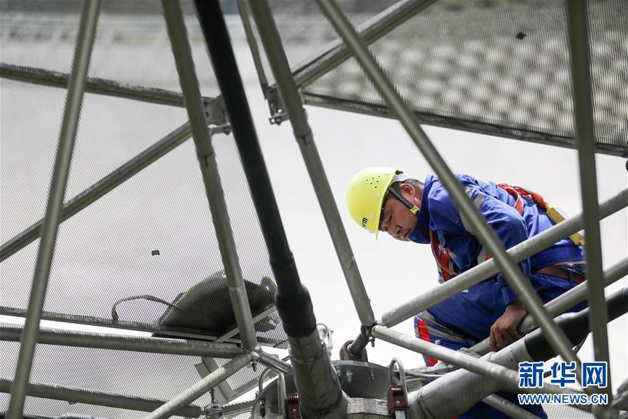 8月28日,工作人員在FAST饋源艙內(nèi)進(jìn)行檢修。 新華社記者 歐東衢 攝