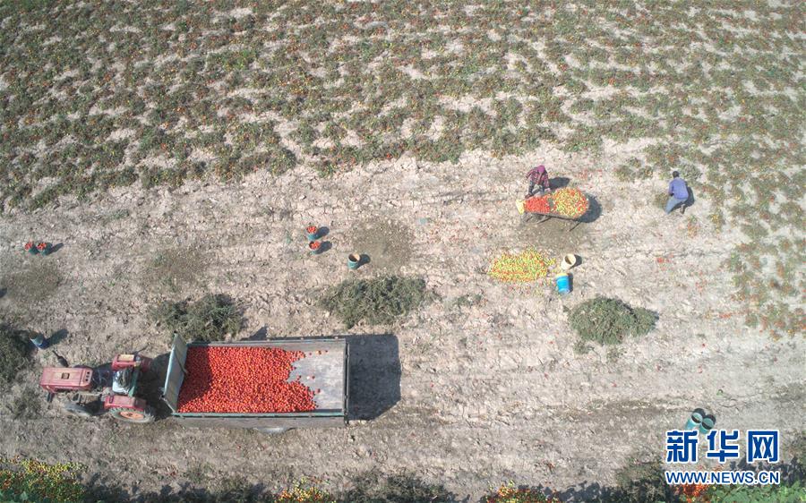 9月4日無人機(jī)拍攝的河套灌區(qū)友愛村四組村民仇漢強(qiáng)夫婦在收獲番茄。 新華社記者 劉詩平 攝