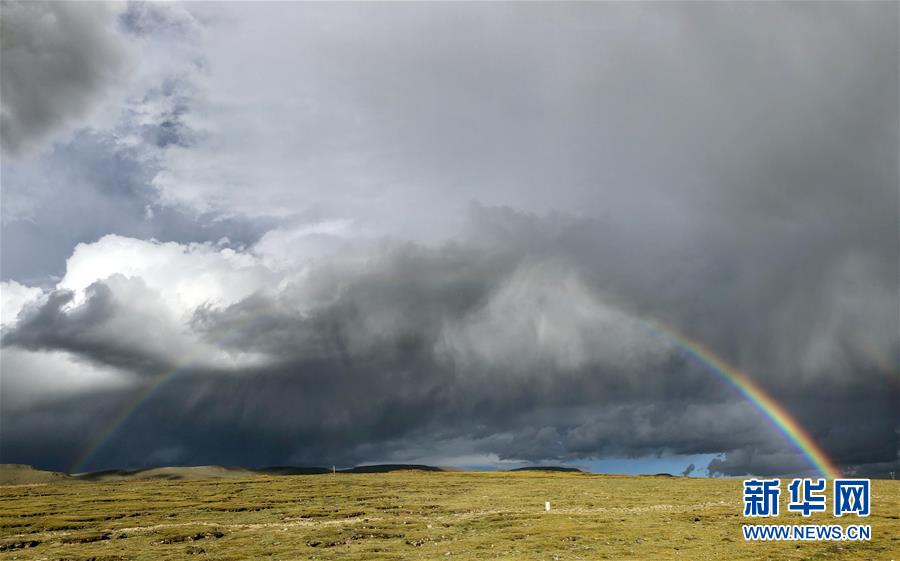 在青海省玉樹(shù)藏族自治州治多縣用手機(jī)拍攝的雨后彩虹(9月11日攝)。新華社記者 鄒樂(lè) 攝