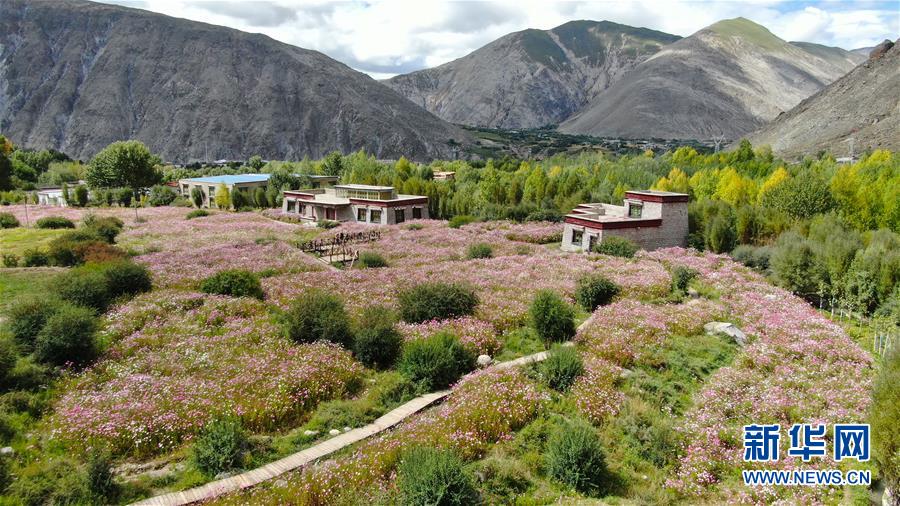 9月13日無人機(jī)拍攝的尼木縣山谷間盛開的波斯菊。  新華社記者 晉美多吉 攝