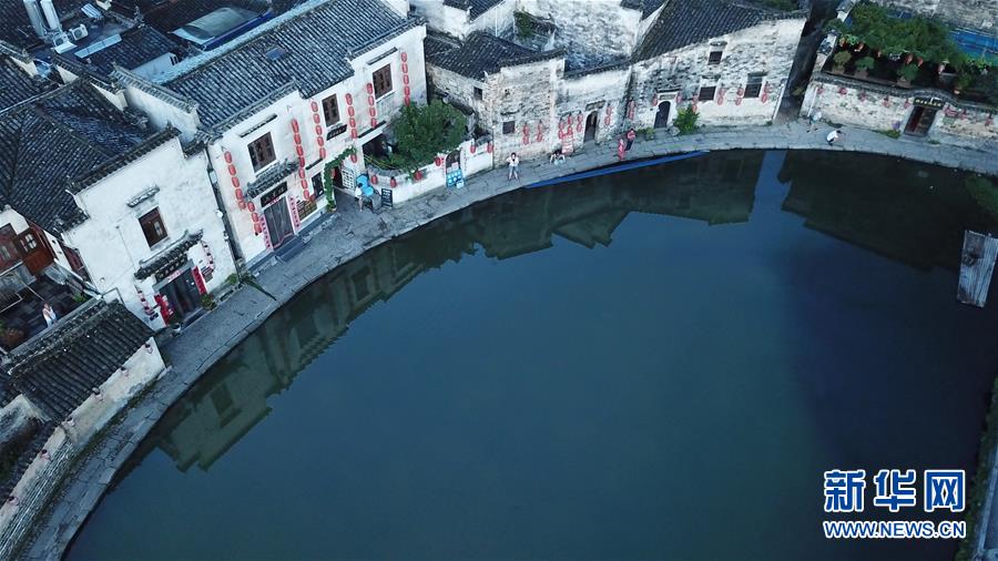 這是8月4日無人機(jī)拍攝的安徽黟縣宏村風(fēng)景區(qū)月沼晨景。新華社記者張端攝
