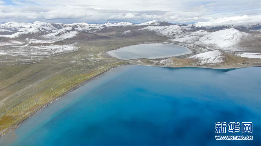 9月24日無人機拍攝的拿日雍錯。拿日雍錯位于西藏山南市錯那縣北部,海拔4900米,像藍(lán)寶石般鑲嵌在雪山草原之間。新華社記者晉美多吉攝