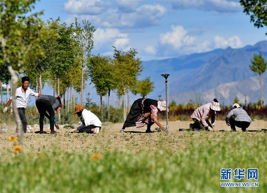 當(dāng)?shù)厝罕娫谏侥鲜性铱h藏草萬畝植物種苗繁育基地勞動(8月29日攝)。 新華社記者 張汝鋒 攝
