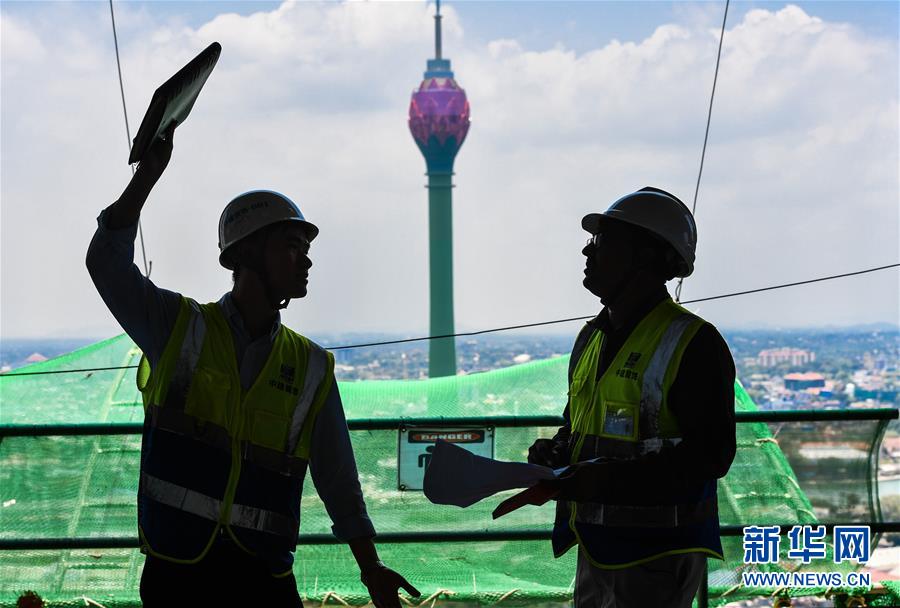 2019年4月9日,在斯里蘭卡科倫坡,中方項(xiàng)目經(jīng)理?xiàng)钭咏ㄗ螅┡c項(xiàng)目副經(jīng)理Thuwan在工地討論工作進(jìn)度,他們背后是科倫坡地標(biāo)建筑蓮花塔。Thuwan是中國(guó)中建裝飾集團(tuán)深圳裝飾公司斯里蘭卡濱江度假村項(xiàng)目的副經(jīng)理。在中方管理人員手把手的指導(dǎo)下,Thuwan從最初的一名普通商務(wù)員變成了一位優(yōu)秀的屬地化管理人員,成為了中斯雙方人員溝通的橋梁。新華社記者劉大偉攝