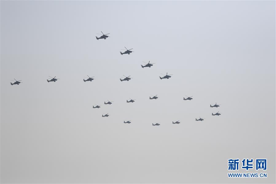 10月1日上午,慶祝中華人民共和國成立70周年大會在北京天安門廣場隆重舉行。這是20架直升機在空中組成“70”字樣。新華社記者王凱攝