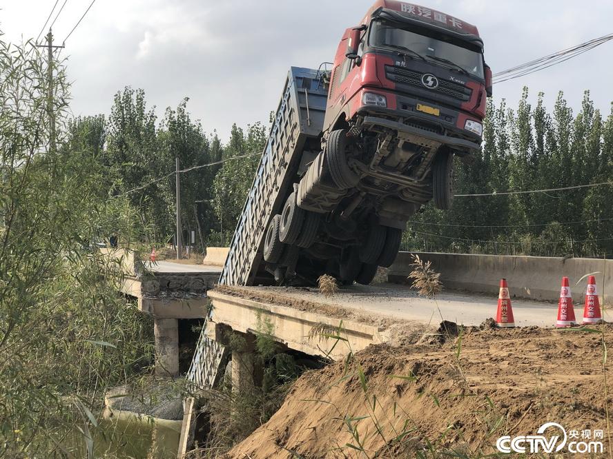 央視網(wǎng)消息:2019年10月13日,山東濱州,一輛滿載貨物的大貨車路過當?shù)匾蛔鶎?米左右的小橋時,致使橋面坍塌。據(jù)報道,13日凌晨4點左右,一輛重型半掛貨車沿渤海十八路由南向北行駛至市西辦事處李茂家村附近,右轉彎進入連接渤海十八路與李茂家村村西鄉(xiāng)間路的一座寬4米左右的小橋時,致使橋面坍塌。現(xiàn)場貨車呈翹起之勢,車頭懸于半空中,車尾插入水中,事故未造成人員傷亡。據(jù)現(xiàn)場了解,該橋建設于1974年,橋頭有警示標識,警示承載4噸。目前救援工作正在緊張有序地進行中。視覺中國