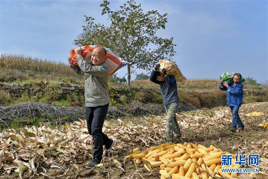 在奪火鄉(xiāng)高谷堆村,第一書記侯俊國(guó)(左)在幫助村民收玉米(10月13日攝)。 新華社記者 曹陽 攝