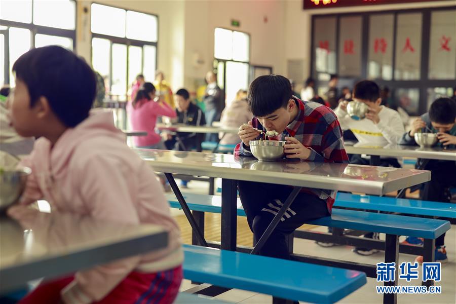 王太樊在學校食堂內吃午飯(10月10日攝)。 新華社記者 劉潺 攝