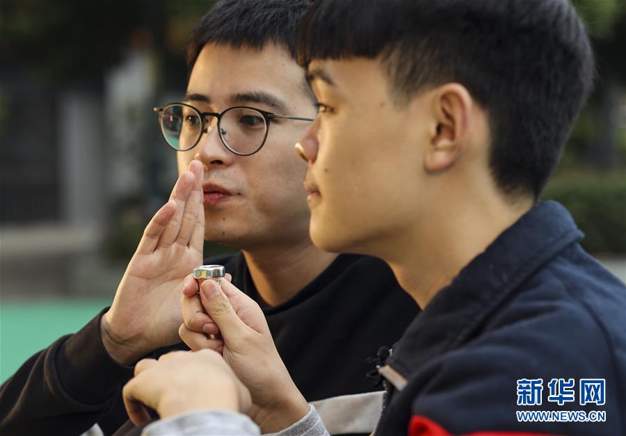 重慶市特殊教育中心的老師李沂念(左一)在教授盲童王太樊練習小號(10月10日攝)。 新華社記者 劉潺 攝