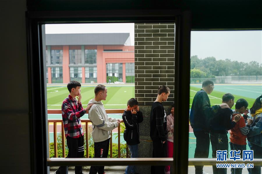 重慶市特殊教育中心的樓道里,王太樊(左一)和同學們相互搭著肩膀排隊進入食堂吃午飯(10月10日攝)。 新華社記者 劉潺 攝