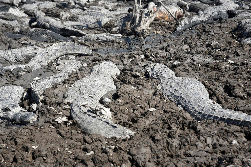 當(dāng)?shù)貢r間2016年6月24日,巴拉圭General Diaz,巴拉圭與阿根廷邊境遭遇嚴(yán)重干旱,皮科馬約河河水枯竭,凱門鱷在水塘內(nèi)。