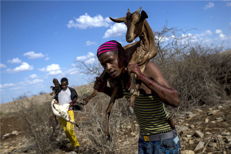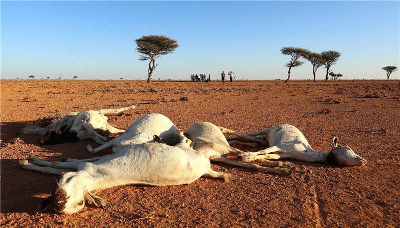 當(dāng)?shù)貢r間2016年12月15日,索馬里邦特蘭,干旱的土地上散布著羊的尸體。當(dāng)?shù)卦庥龈珊堤鞖猓笫艿轿:Α?/p>