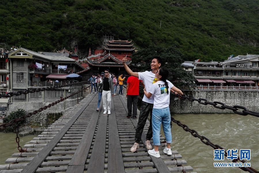 一對情侶在瀘定橋上留影(6月27日攝)。 新華社記者 江宏景 攝