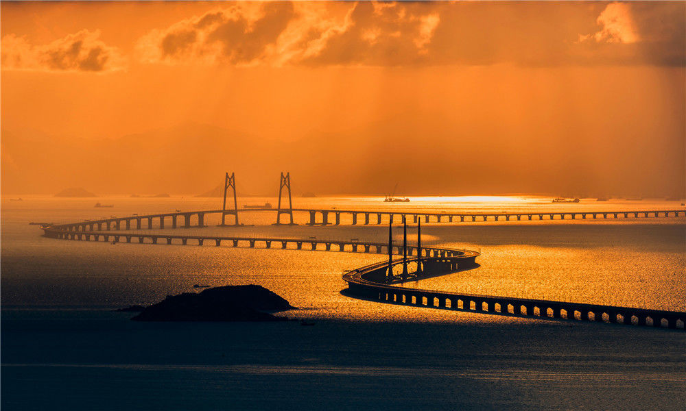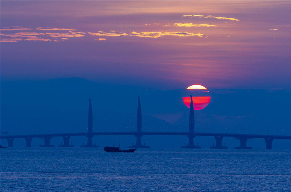 2018年10月22日早晨,從廣東珠海市的情侶路向東眺望,一輪紅日從東方冉冉升起,將港珠澳大橋映射得格外迷人?!俺?jí)工程”港珠澳大橋?qū)⒂?4日上午9時(shí)正式通車(chē)。張煒(香港分社)/中新社/視覺(jué)中國(guó)
