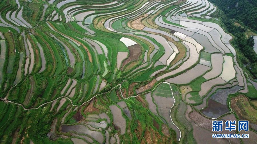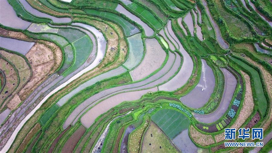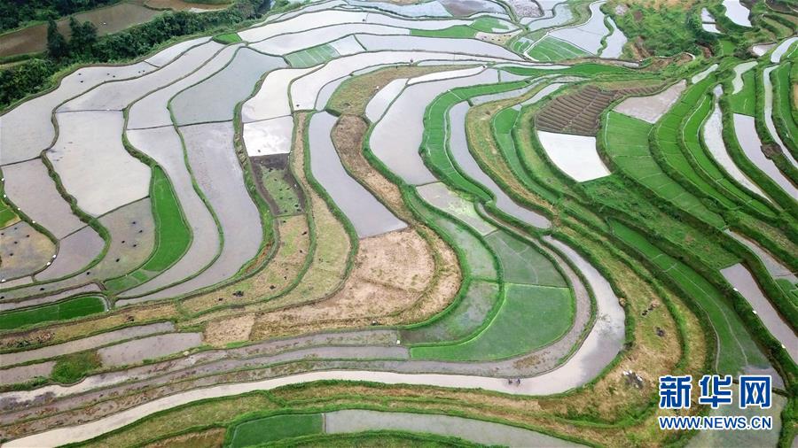 5月18日,農(nóng)民在貴州省丹寨縣龍泉鎮(zhèn)高要梯田里耕作(無人機拍攝)。初夏時節(jié),位于貴州省丹寨縣龍泉鎮(zhèn)的高要梯田景色優(yōu)美。新華社記者楊文斌攝