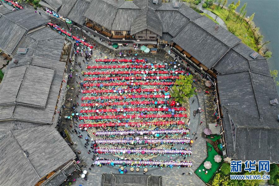 丹寨縣萬達(dá)小鎮(zhèn)“萬人長桌宴”(10月26日無人機拍攝)。新華社記者歐東衢攝