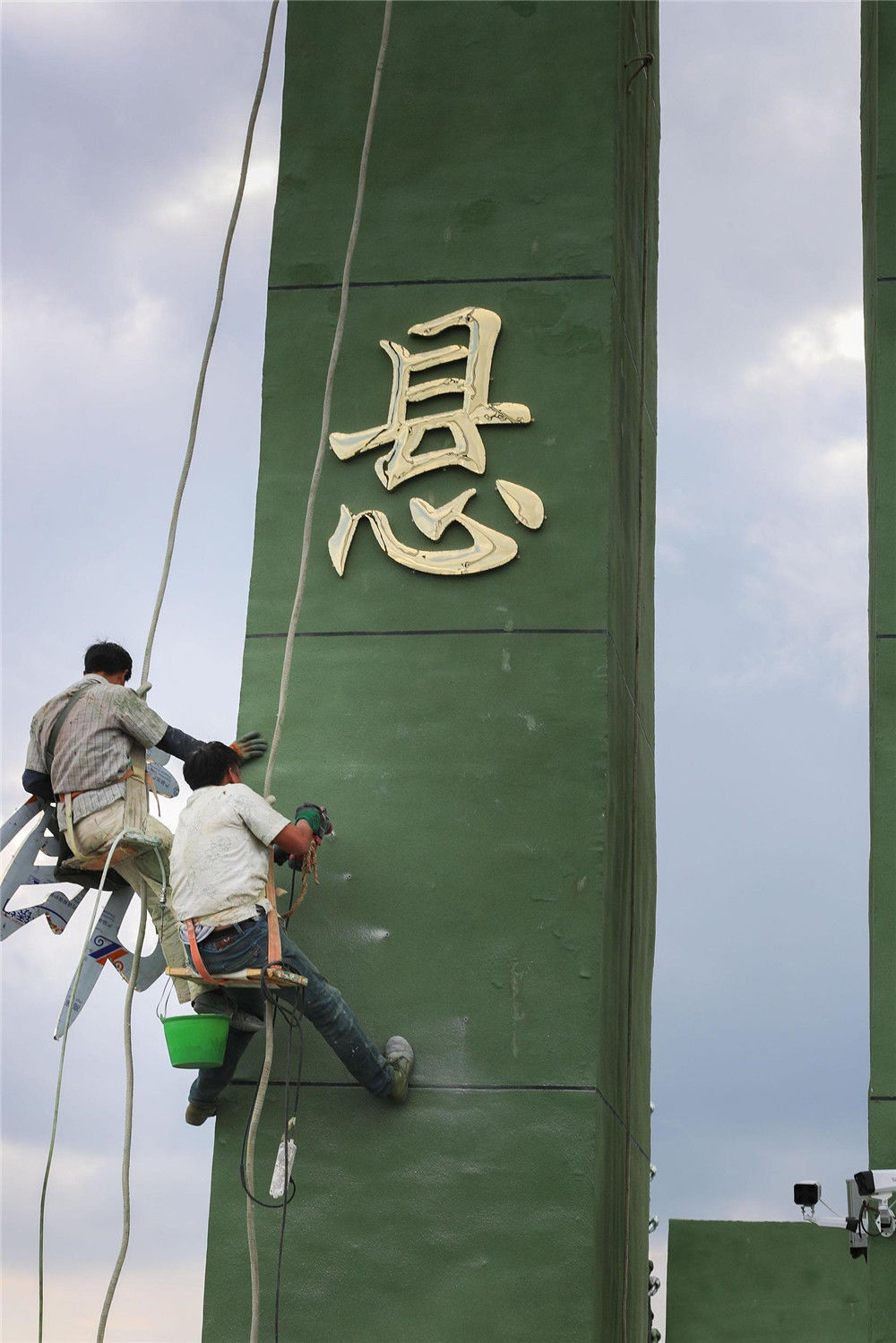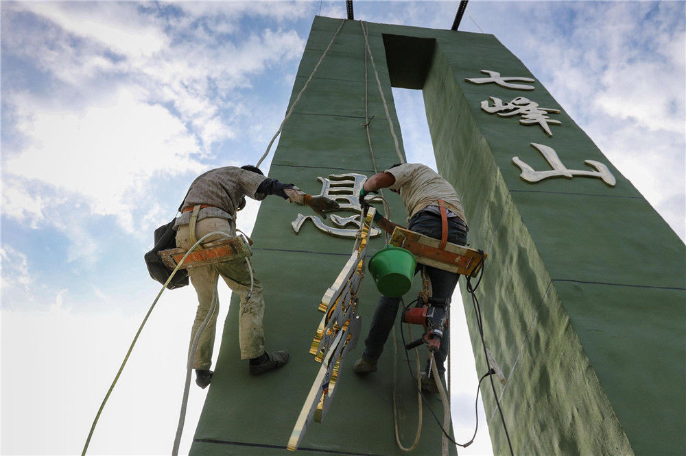 2019年9月20日,從落差198米懸崖上伸出周長60米懸空的“高空玻璃懸廊”在河南南陽七峰山落成,該玻璃懸廊名為“云頂之心”。圖為建筑工人進(jìn)行收尾工作。王中舉(河南分社)/中新社/視覺中國編輯/康娜