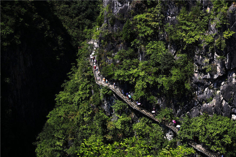 2019年9月13日,游客在重慶市黔江區(qū)城市峽谷景區(qū)芭拉胡的懸崖棧道上游玩。當(dāng)天是中秋節(jié)假的第一天。楊敏/視覺中國編輯/陳進(jìn)