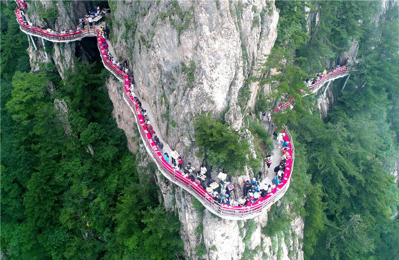 2018年6月23日,陜西渭南,游客們在少華山懸空玻璃棧道上游覽拍照。航拍少華山懸空玻璃棧道,下面就是懸崖密林。王警/視覺中國