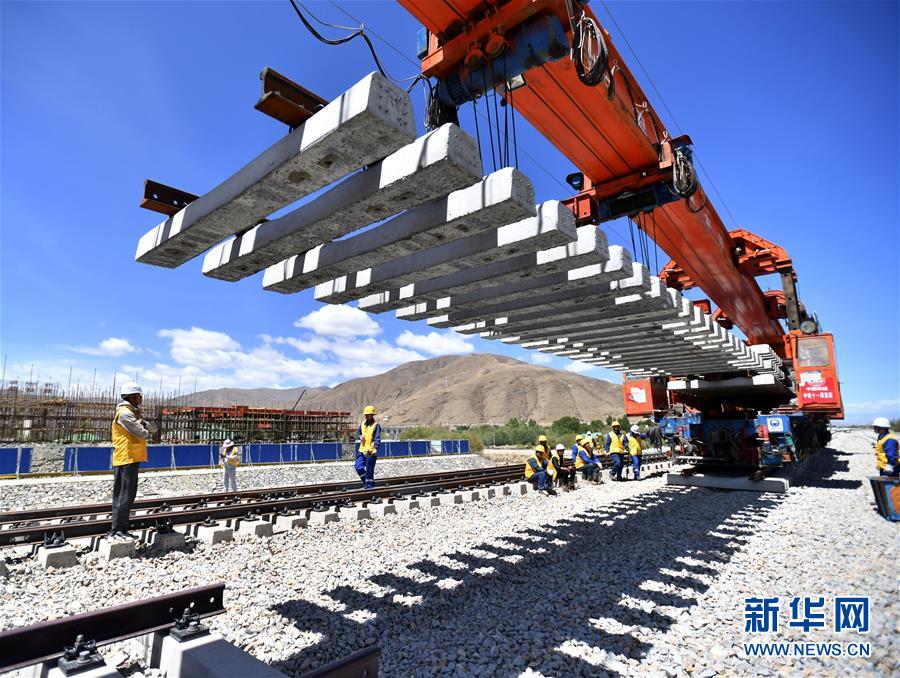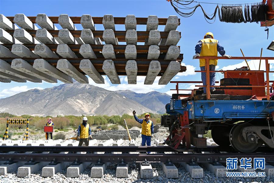6月6日,負(fù)責(zé)鋪軌的中鐵十一局集團的建設(shè)者在現(xiàn)場作業(yè)。新華社記者普布扎西攝